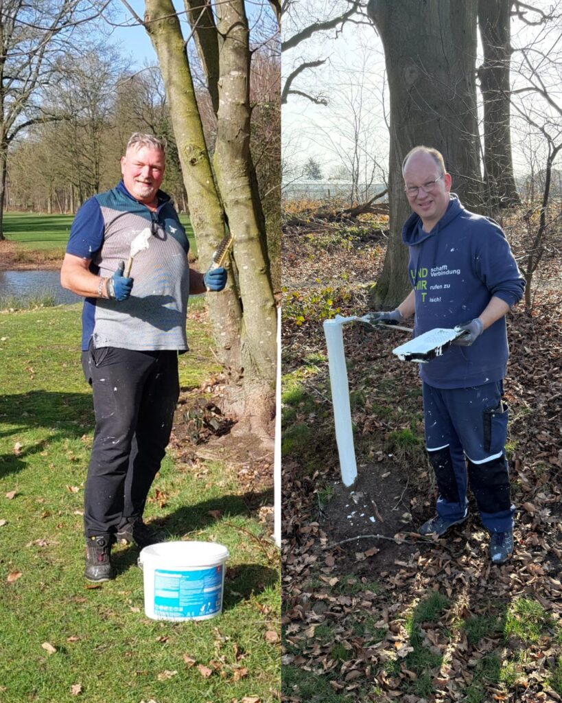 Alte weiße Pfähle werden neu gestrichen, die Greenkeeper sind damit beschäftigt die Bunkerränder abzustechen, neue weiße Pfähle werden gesetzt und auch die Roten bekommen einen neuen Anstrich.